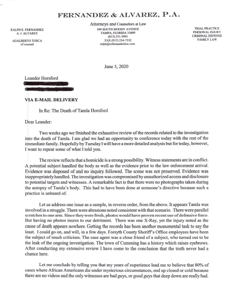 In 2020, the case was reportedly re-opened due to public outcry, however I was not able to find any updated information or investigation. The Horsford family attorney wrote the following letter to Tamla’s husband after his investigation into her death:
