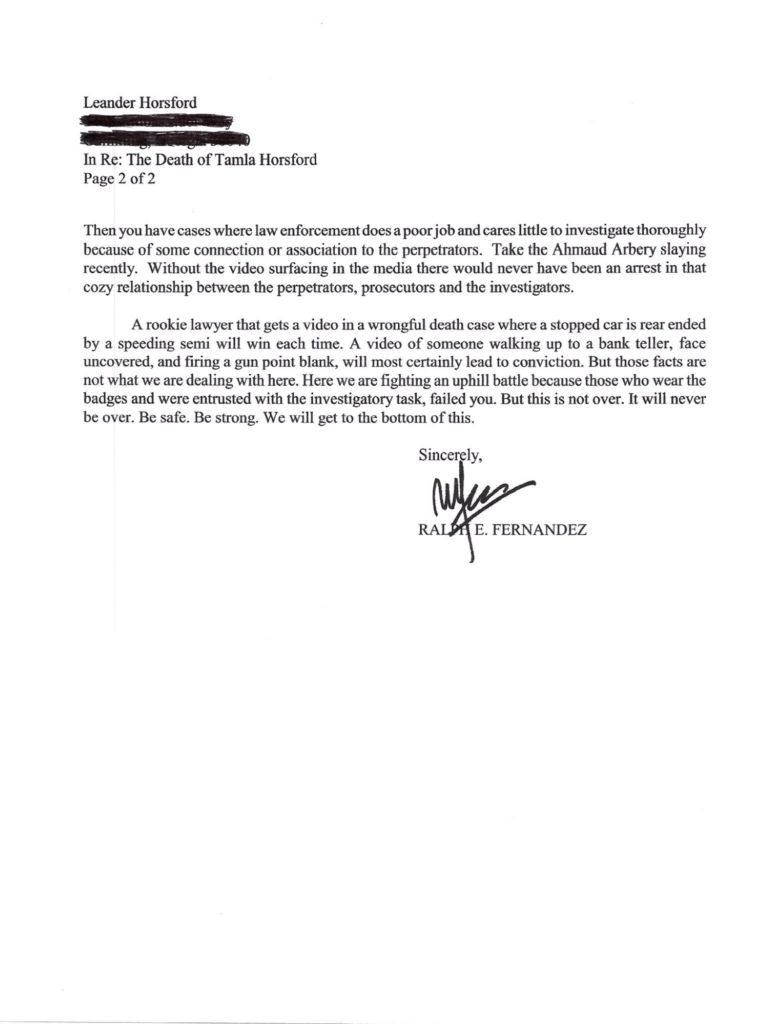 In 2020, the case was reportedly re-opened due to public outcry, however I was not able to find any updated information or investigation. The Horsford family attorney wrote the following letter to Tamla’s husband after his investigation into her death: